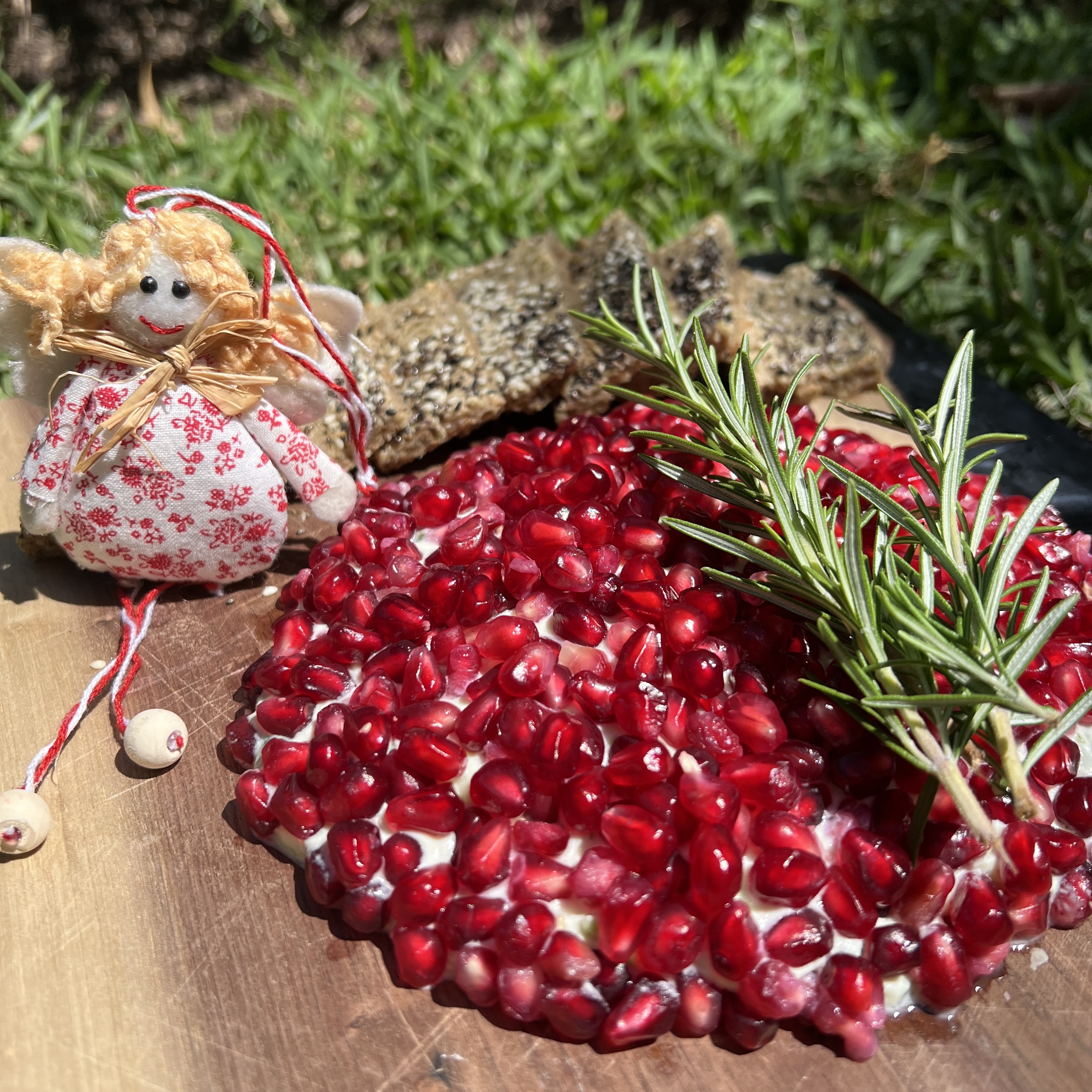 Remove the Pomegranate Avrils and set aside. Place garlic clove, rosemary, spring onion, pepper, chives in a blend and cut til fine. then I put the chosen cheese in the blender and blend quickly and shape the the cheese and herb ball into a round shape on plate to be served. It is easier to make it ball shape with the lactose free cream cheese. Then I cover the ball with the set aside pomegrante avrils. Garnish with a swig of rosemary.