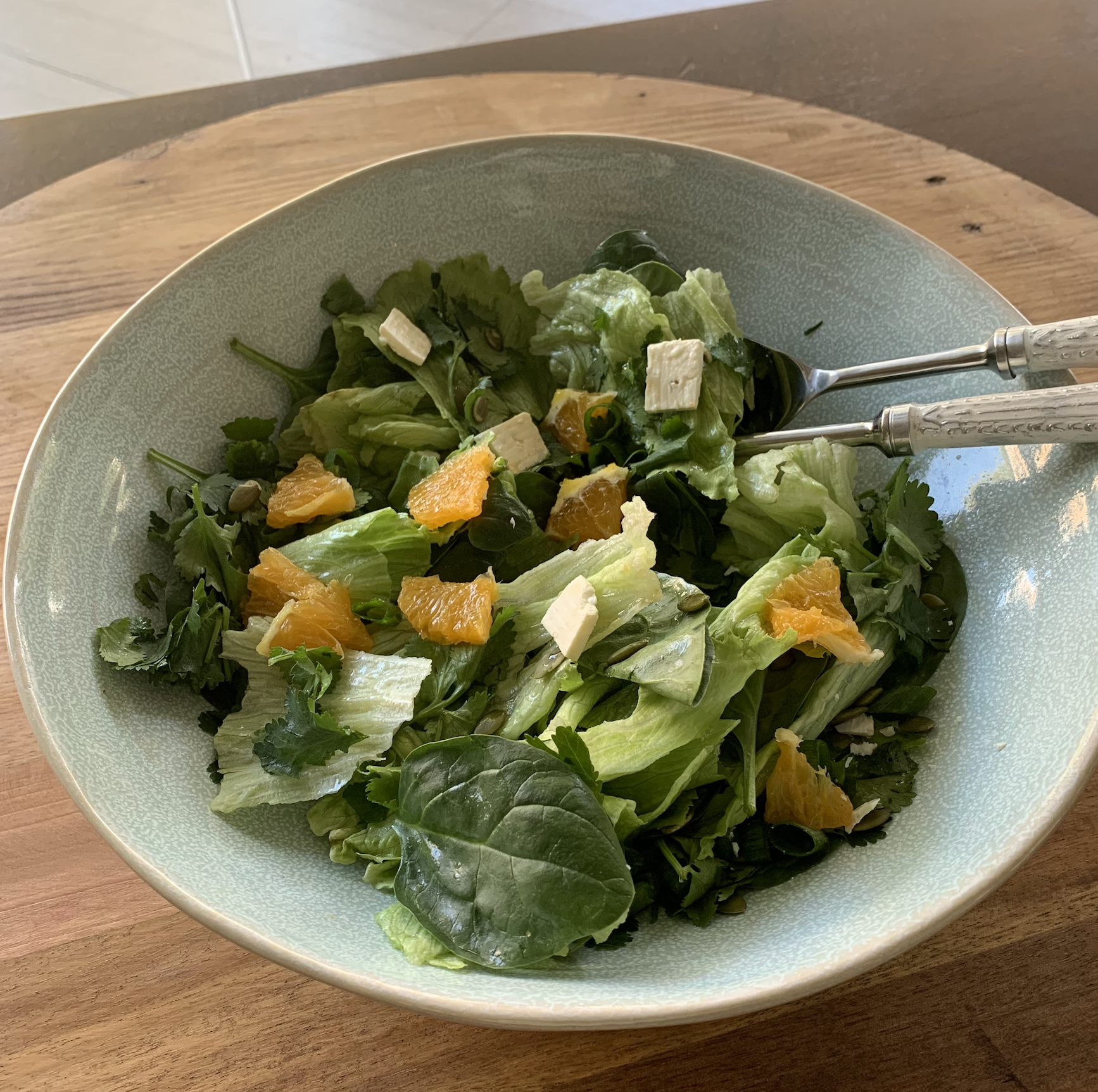 For a simple summer salad place the lettuce then sprinkle with cut spring onions finely cut. Add the coriander and slice up the orange and cut into little pieces. Top with pepita seeds and fetta and then lastly pour the lime juice on top before serving.Enjoy